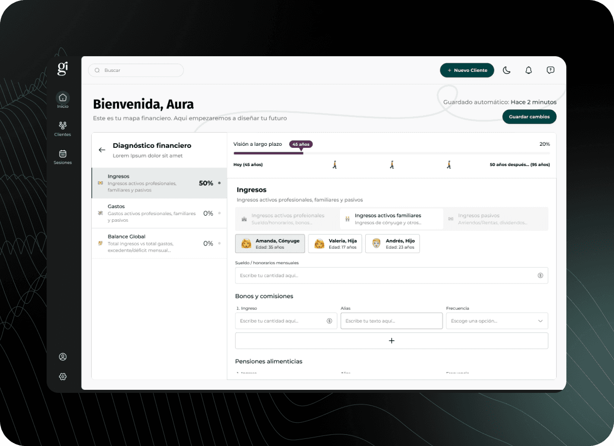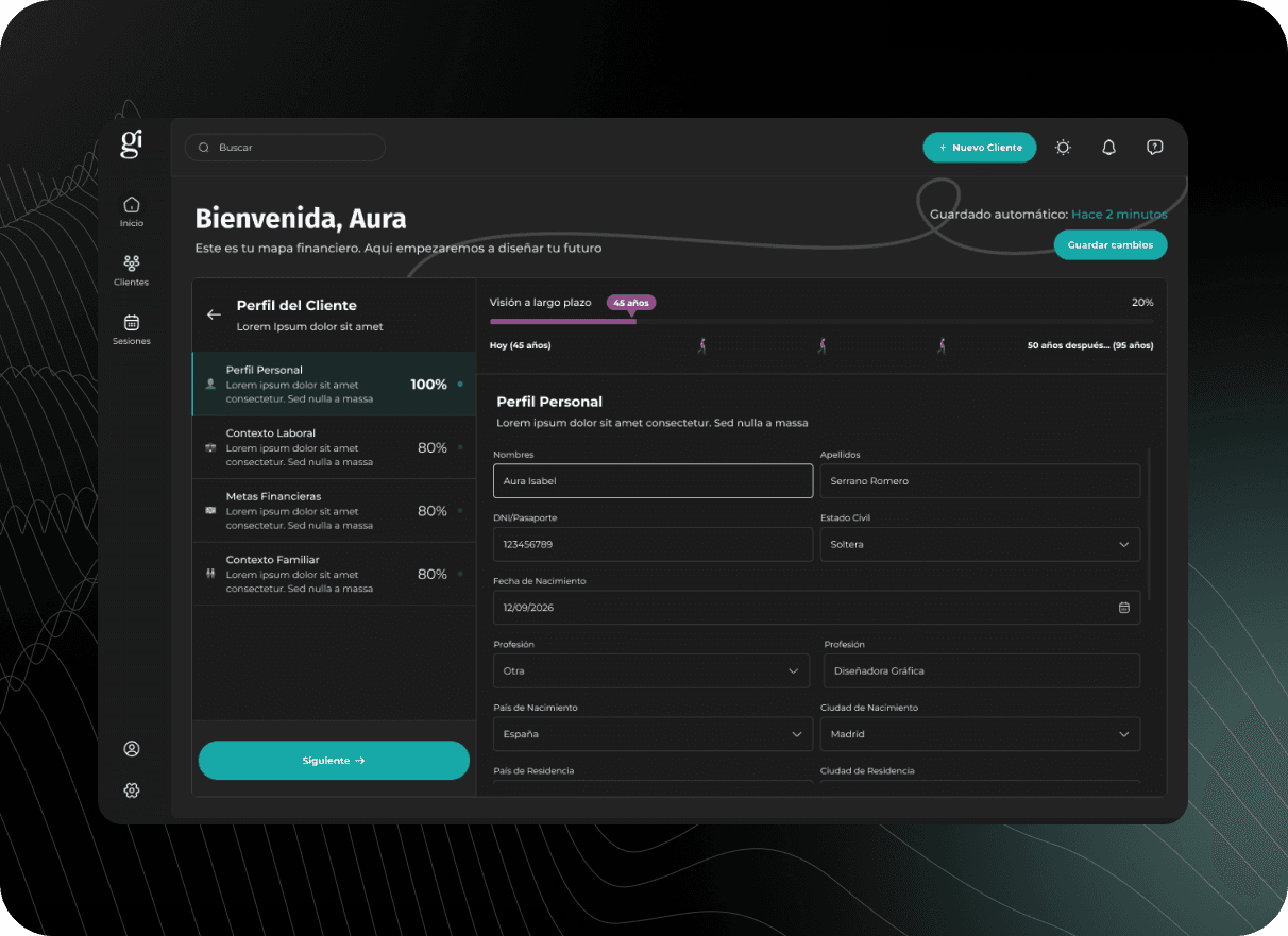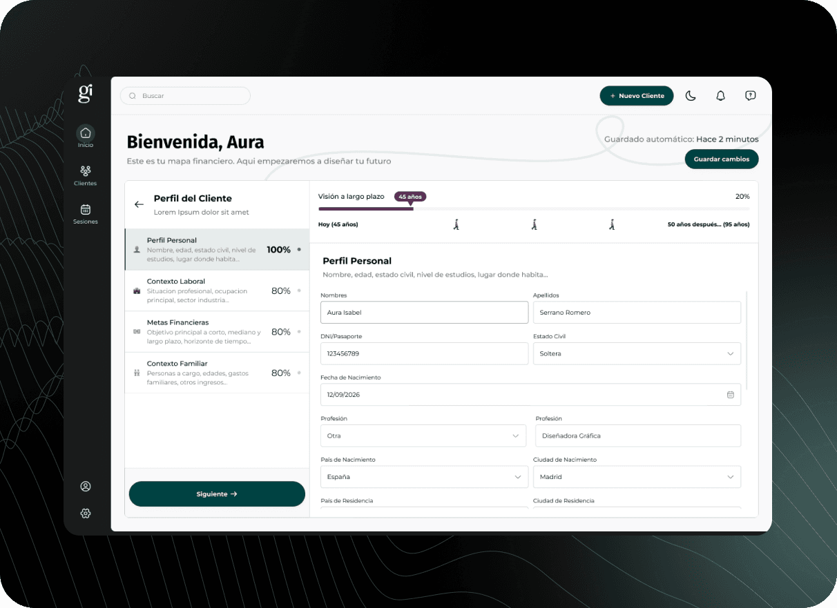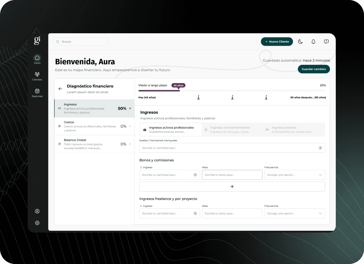 Ginvest is a prominent Spanish financial advisory and asset management firm. For this project, I designed a proprietary Financial Planner—a strategic desktop tool created to streamline how Ginvest’s advisors perform deep-dive client diagnostics. The platform serves as a professional workstation to manage complex portfolios and generate high-value projections for the firm’s private wealth clients.