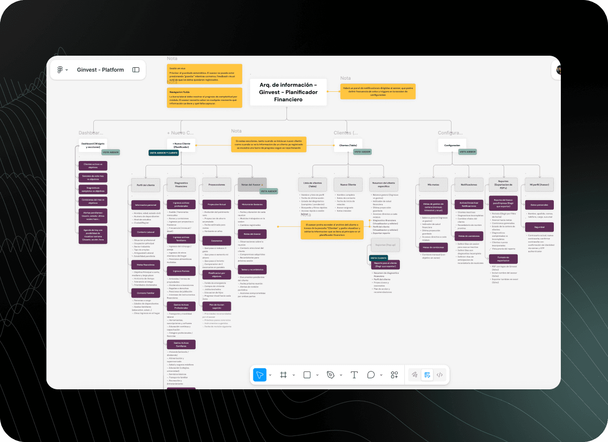 The discovery phase involved analyzing the specific financial regulations and reporting standards of the Spanish market. I collaborated with Ginvest’s senior advisors to map the 'Client Discovery' journey, identifying the essential data points needed for a holistic audit: from professional cash flows and family liabilities to asset allocation and tax considerations.